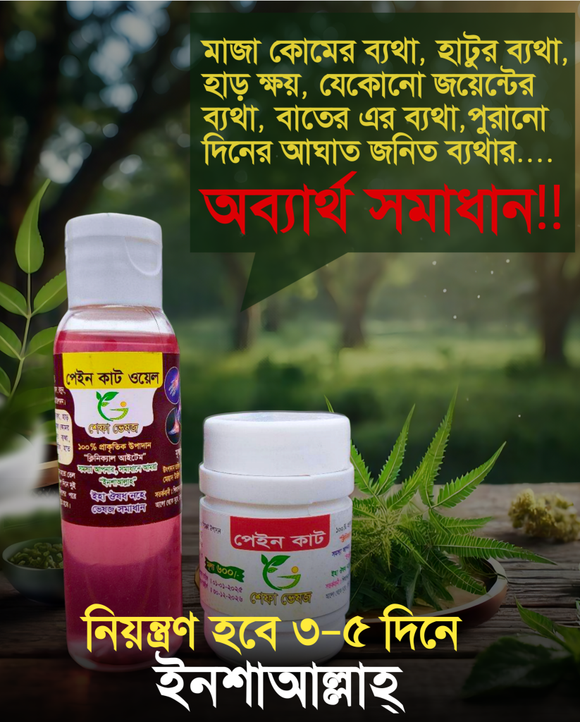 “পেইন কাট ভেষজ এবং পেইন কাট অয়েল” আয়ুর্বেদিক সাইন্সের একটি অব্যর্থ প্রোডাক্ট, আয়ুর্বেদিক বিশেষজ্ঞ এবং গবেষকদের দীর্ঘদিন গবেষণার ফল, এটা কোন কেমিক্যাল যুক্ত প্রোডাক্ট না। তাই কোন পার্শ্ব প্রতিক্রিয়া ছাড়াই "মাজা ব্যথা, হাঁটুর ব্যথা,বাতের ব্যথা,শরীরের যেকোনো জয়েন্টের ব্যথা,মাংস-পেশির ব্যথা,মাথা ব্যথা,পুরনো দিনের আঘাত জনিত ব্যথা" দূর করবে।